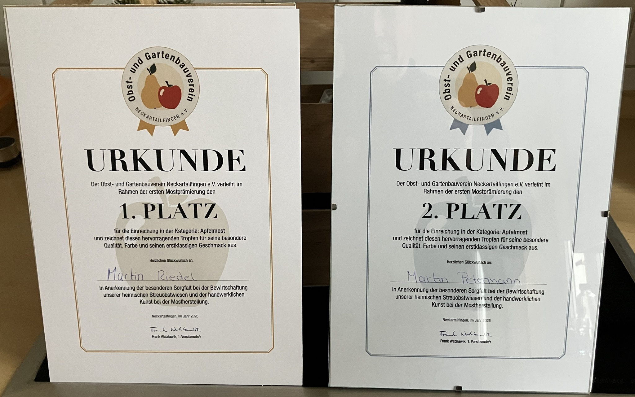 bei der 1. Mostprämierung, ausgetragen vom OGV Neckartailfingen konnten 2 Mitglieder des OGV Neckarhausen den ersten und zweiten Platz belegen.